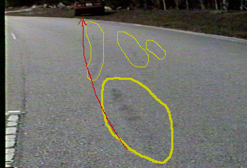 the tip of the yellow arrow is where the bike ended up. Note the huge divot
